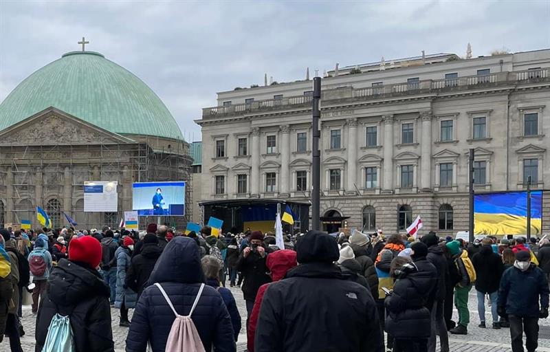 Większość mówców pojawiała się na pl. Augusta Bebla na wielkim monitorze. Łączyli się z Berlinem ze swoich miast. Jurij Prochaśko, prozaik i tłumacz związany z Lwowem, charakteryzował putinizm. Mówił, że jest to ustrój przestępczy, dyktatura totalna, korupcjogenna, nienawidząca wolności i praworządności, że to imperialny szowinizm, ufundowany na moskiewskim prawosławiu i wielkoruskim mesjanizmie. Dodawał, że jest to również pielęgnowana nienawiść do Ukrainy i Ukraińców.