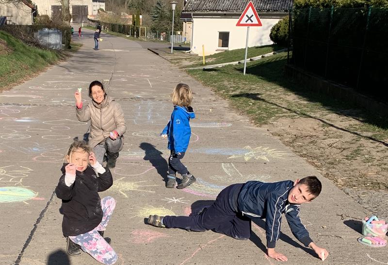 – Jesteśmy tu w najlepszym miejscu na takie czasy. Wieś jest mała, mało ludzi, po raz kolejny odkrywamy piękno życia rodzinnego, lecz także sąsiedzkiego. W ubiegłym tygodniu umówiliśmy się telefonicznie z sąsiadami, że będziemy malować naszą ulicę kolorowymi kredami, każda rodzina przed swoim domem. Między rodzinami była spora odległość – około 50 metrów. Pozdrawialiśmy się, rysowaliśmy słońca, kolorowe tęcze, niebo, kwiaty, uśmiechy – rodzice z dziećmi. Dla dzieciaków i dla nas była to wielka frajda.