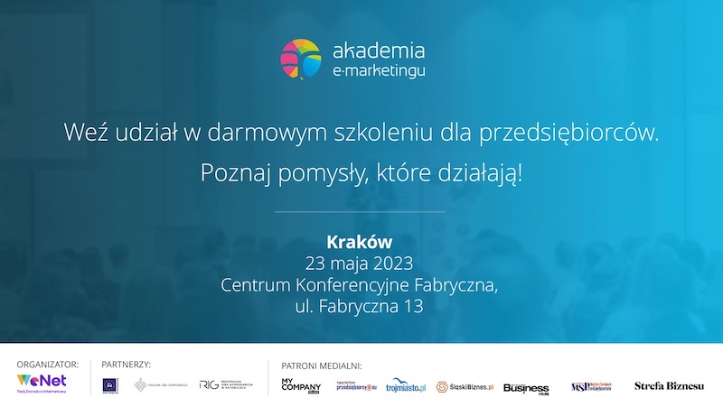 Trwa 11. edycja Akademii e-marketingu, która jest cyklem darmowych szkoleń z budowania strategii rozwoju biznesu w internecie. Szkolenia skierowane są do właścicieli małych i średnich firm. Organizowane są w kilku dużych polskich miastach, w tym w Krakowie. Akademia e-marketingu odbędzie się 23 maja 2023 roku w Centrum Konferencyjnym Fabryczna. Uczestnicy w trakcie spotkań z ekspertami będą mogli zdobyć lub poszerzyć swoją wiedzę np. z zakresu tworzenia strony www, prowadzenia działań SEO czy wykorzystania narzędzi promocyjnych.