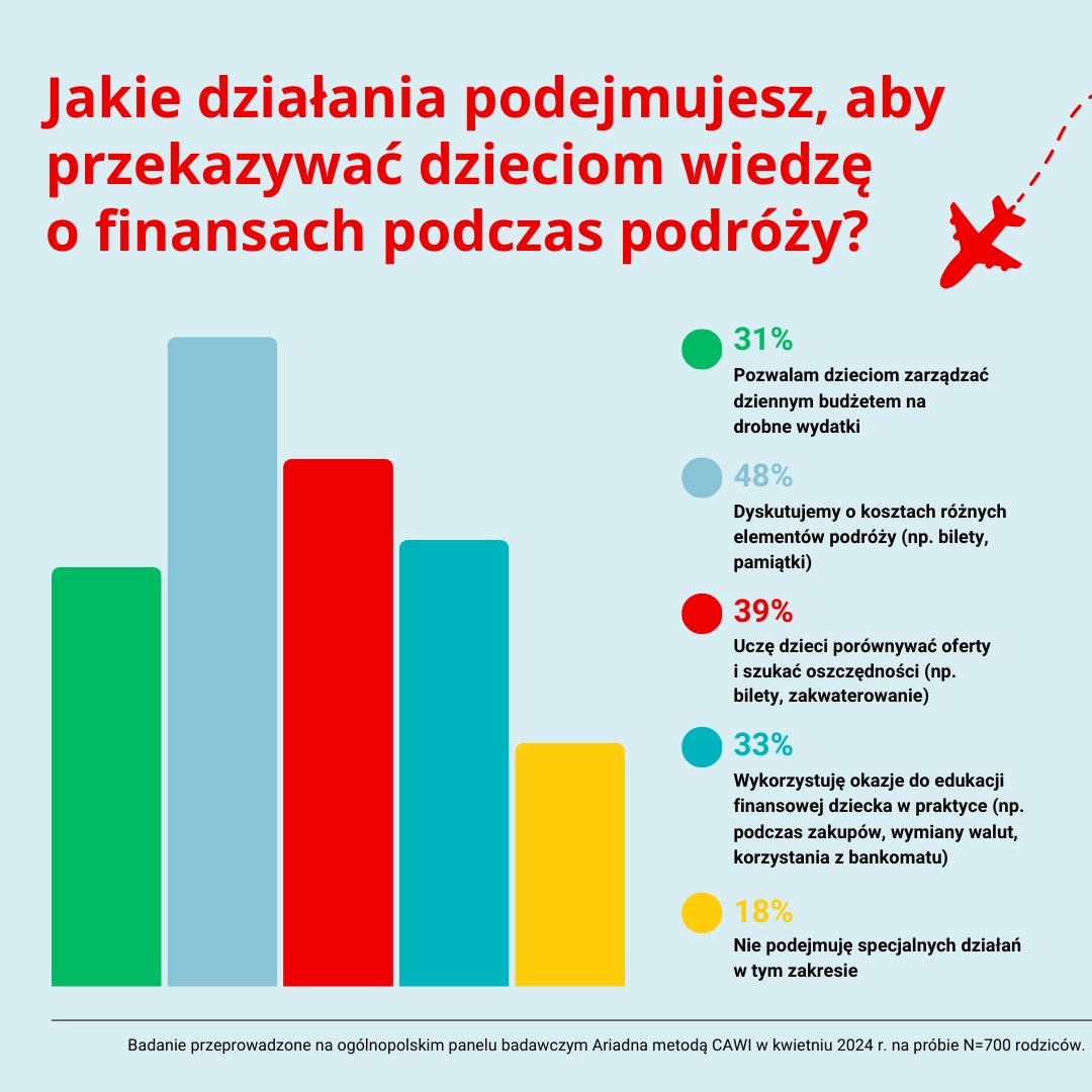 Niemal połowa badanych twierdzi, że dyskutuje ze swoimi pociechami na temat kosztów różnych elementów wyjazdu, takich jak bilety czy pamiątki. 39% rodziców uczy dzieci porównywać oferty i szukać oszczędności przy wyborze biletów lub zakwaterowania. 33% badanych wykorzystuje okazje do edukacji finansowej dzieci w praktyce podczas zakupów, wymiany walut czy korzystania z bankomatu. 31% pozwala dzieciom zarządzać dziennym budżetem na drobne wydatki. 18% badanych przyznaje, że nie podejmuje żadnych działań w tym zakresie.
