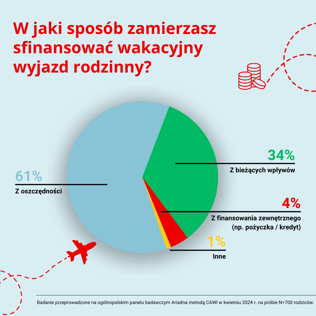 Większość rodzinnych wakacji, bo aż 61%, zostanie sfinansowana ze zgromadzonych oszczędności. Natomiast 34% respondentów zdecyduje się na pokrycie kosztów wakacji bardziej spontanicznie – z bieżących wpływów. Z kolei stosunkowo niewielka grupa, bo tylko 4% badanych, planuje zaciągnięcie kredytu lub pożyczki na opłacenie wakacji.