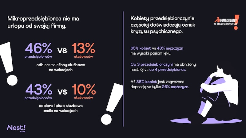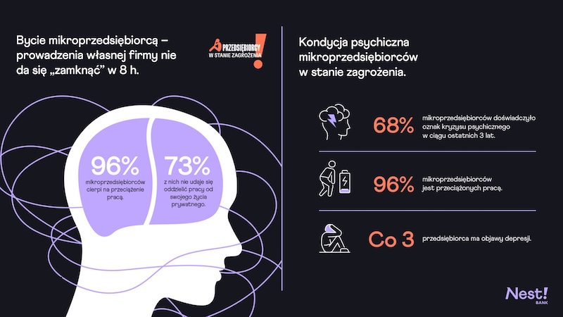 „Najbardziej charakterystyczną cechą współczesnych mikroprzedsiębiorców jest wysokie obciążenie pracą oraz brak >>work-life balance<<. To powoduje, że przedsiębiorcy niemal nie odpoczywają - brak im takiej przestrzeni, w której mogliby się zregenerować, naładować baterie i nabrać dystansu” - mówi Magdalena Zajkowska, wiceprezeska Nest Bank. „Dlatego zainicjowaliśmy kampanię społeczną >>Przedsiębiorcy w stanie zagrożenia<<, by pokazać, że zdrowie psychiczne tej grupy jest bardzo ważne - dla nich samych, ich bliskich, ale też dla nas jako społeczeństwa” - dodaje.