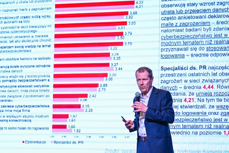 Według zreferowanych przez niego wyników badania 94,2 proc. dziennikarzy oraz 87,4 proc. specjalistów ds. PR wie, czym jest malware, czyli złośliwe oprogramowanie. 89,4 proc. dziennikarzy oraz 63,9 proc. specjalistów ds. PR słyszało o ransomware, czyli ataku polegającym na zablokowaniu dostępu do systemu i żądaniu okupu za jego odblokowanie, z kolei o sniffingu (podsłuch komputerowy) wie 79,8 proc. dziennikarzy oraz 73,1 proc. specjalistów ds. PR. Najmniejszy odsetek badanych przyznał, że zna pojęcie DoS/DDoS - było to odpowiednio 71,2 proc. dziennikarzy oraz 54,6 proc. specjalistów ds. PR.