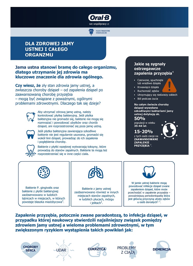 Zapalenie przyzębia jest szóstą najczęstszą chorobą na świecie, a koszty ponoszone przez jednostki i społeczeństwa w związku z ich leczeniem są ogromne – sięgają setek miliardów euro rocznie. Stomatolodzy alarmują, że choroby jamy ustnej to nie tylko duży wydatek, ale także potencjalne zagrożenie dla zdrowia ogólnego. Szczególną uwagę zwraca się na tę zależność 20 marca, kiedy obchodzony jest Światowy Dzień Zdrowia Jamy Ustnej, z okazji którego Polskie Towarzystwo Stomatologiczne zainicjowało kampanię „Polska mówi aaa…” pod hasłem „Zdrowa jama ustna to uśmiech na całe życie”.