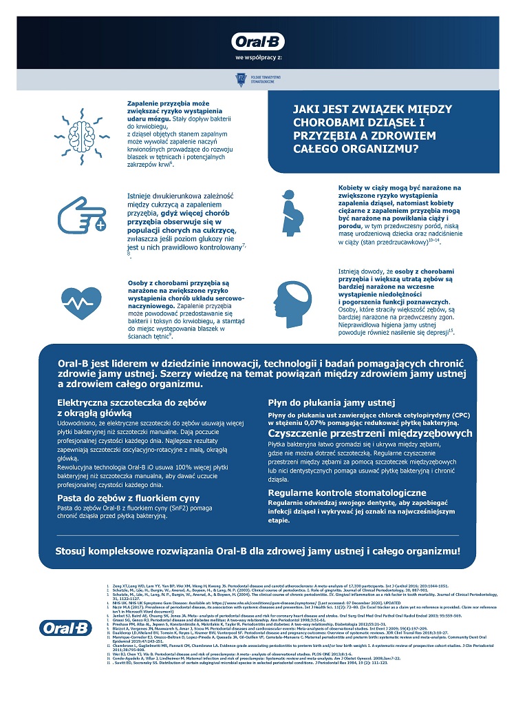 Należąca do Procter & Gamble marka Oral-B, partner akcji, wraz z organizatorem szerzą wiedzę na temat zdrowia jamy ustnej i chorób przyzębia, a także zachęcają do skorzystania z ponad 2800 bezpłatnych konsultacji stomatologicznych połączonych z instruktażem prawidłowej higieny jamy ustnej realizowanych w wybranych gabinetach sieci Lux Med Stomatologia oraz gabinetach partnerskich Oral-B. W kontekście przypadającego 4 marca Światowego Dnia Otyłości, choroby, która często połączona jest z zachorowaniami na cukrzycę typu 2, PTS oraz marka Oral-B alarmują, że choroby przyzębia i cukrzyca często są ze sobą powiązane.