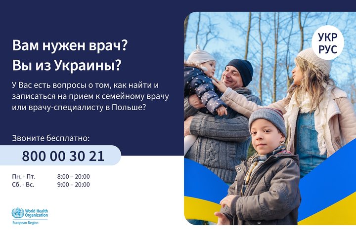 Всемирная организация здравоохранения (ВОЗ) запустила горячую линию для беженцев из Украины. По указанному номеру можно получить исчерпывающую информацию о доступных услугах в рамках польской системы здравоохранения, например: как записаться на прием к врачу в Польше, как сделать прививки, продолжить лечение хронических заболеваний или получить психологическую помощь.