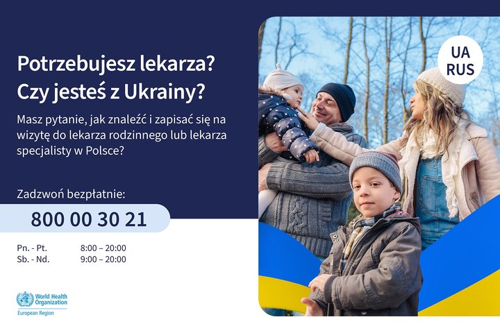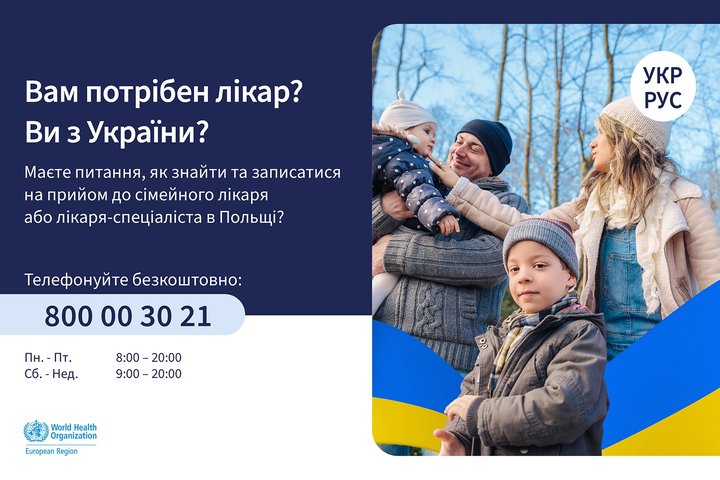 Всесвітня організація охорони здоров'я (ВООЗ) запустила гарячу лінію для біженців з України. За вказаним номером можна отримати вичерпну інформацію щодо доступних послуг у рамах польської системи охорони здоров’я, наприклад: як записатися на прийом до лікаря в Польщі, як отримати щеплення, продовжити лікування хронічних захворювань, або отримати психологічну допомогу.