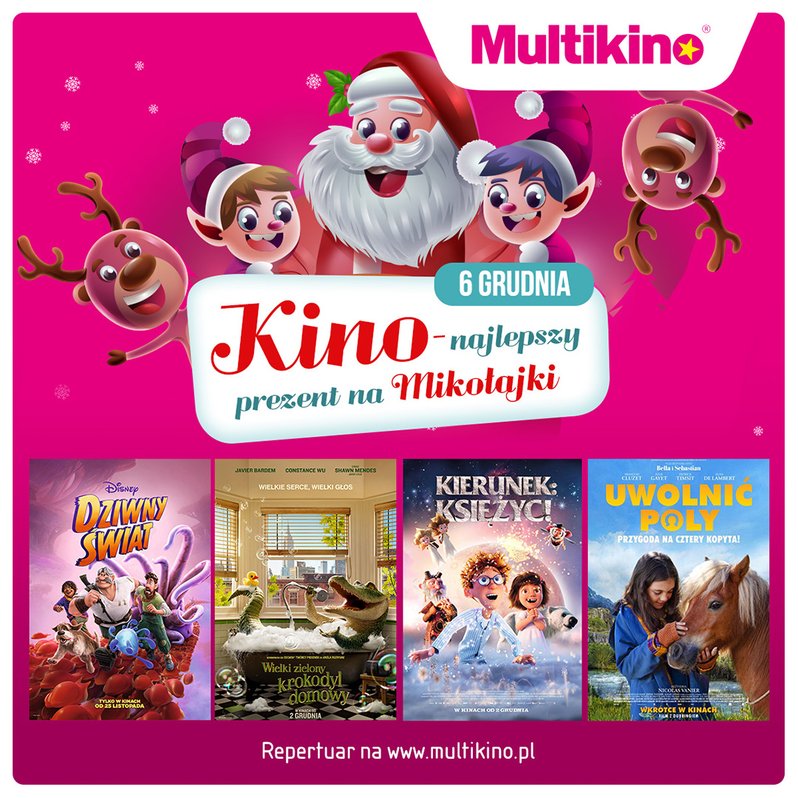 W weekend 3 i 4 grudnia oraz we wtorek 6 grudnia Multikino zaprasza najmłodszych kinomanów do świętowania Mikołajek. W repertuarze znajdą się animacje i filmy familijne: „Dziwny świat”, „Kierunek księżyc!”, „Wielki Zielony Krokodyl Domowy” oraz „Uwolnić Poly”.