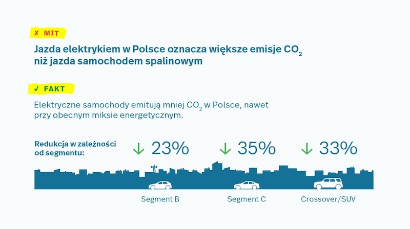 Dzisiaj auto elektryczne w Polsce generuje nawet o 1/3 mniej CO2 od auta spalinowego, jest też lepsze dla klimatu także od hybryd. Kluczowe jest zbadanie całego cyklu życia - a więc emisji związanych z produkcją, użytkowaniem oraz utylizacją. Przy założeniu, że samochód elektryczny i spalinowy jest eksploatowany przez 15 lat (to średnia wieku aut w Polsce) i przejeżdża w tym czasie 150 tys. km, to emisje CO2 z samochodu elektrycznego eksploatowanego nawet w Polsce są znacznie mniejsze od spalinowego.