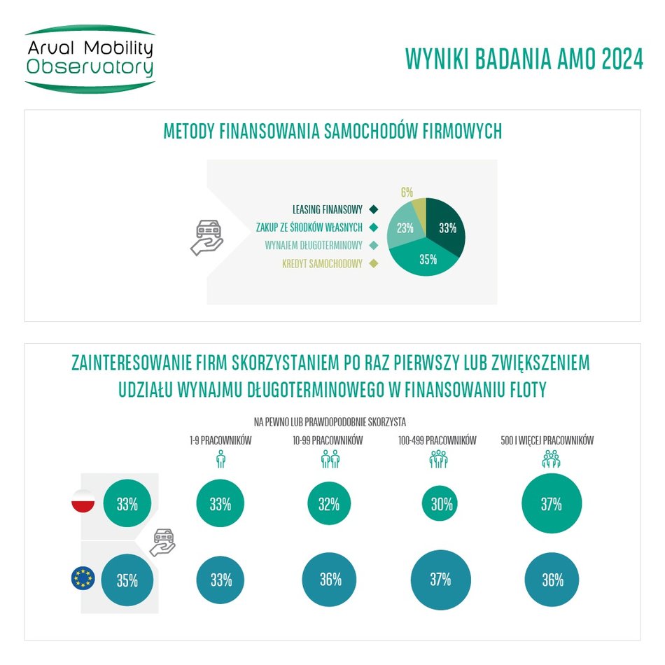 W badaniu Arval Mobility Observatory zakup ze środków własnych znów wysunął się na prowadzenie, jeśli chodzi o najpopularniejszą formę finansowania nowych samochodów firmowych. Jako główny sposób pozyskiwania aut do firm wskazało go 35 proc. ankietowanych. W co trzecim przedsiębiorstwie to leasing jest główną formą finansowania pojazdów, a wynajem długoterminowy został wskazany przez niemal co czwartego respondenta (23 proc.). Zakup samochodu na kredyt to rozwiązanie, które z roku na rok traci na popularności - już tylko 6 proc. respondentów traktuje je jako podstawę finansowania floty.