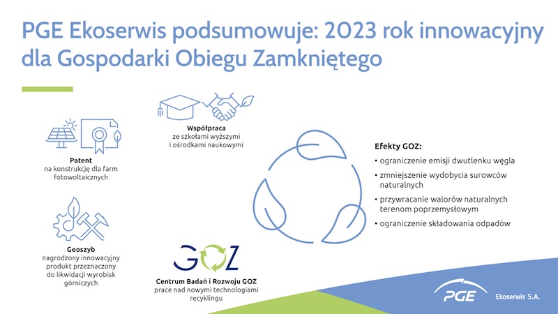 Umocnienie się na pozycji lidera krajowej branży GOZ, patent na konstrukcję dla farm fotowoltaicznych, nagrodzony innowacyjny produkt przeznaczony do likwidacji wyrobisk górniczych oraz prace nad nowymi technologiami recyklingu odpadów z OZE prowadzone przez Centrum Badań i Rozwoju GOZ - tak w skrócie wyglądał 2023 rok w projektach gospodarki cyrkularnej prowadzonych przez PGE Ekoserwis, spółkę z Grupy PGE i lidera GOZ w Polsce.