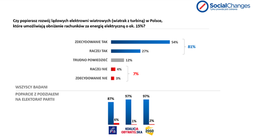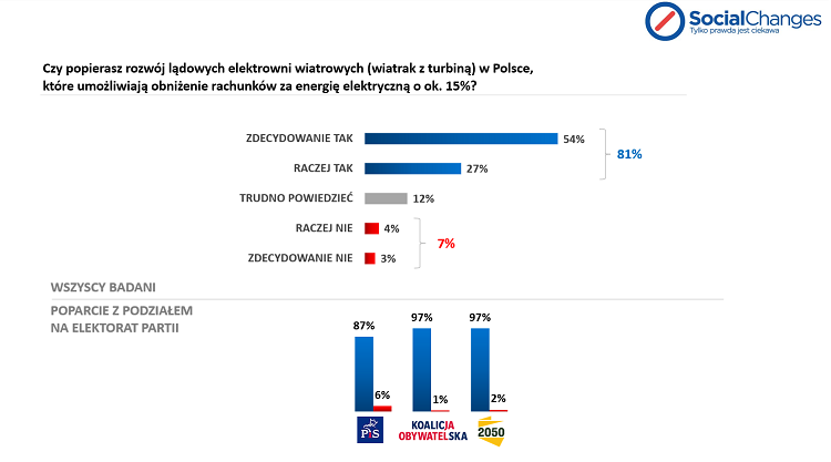 81% Polaków popiera rozwój lądowych elektrowni wiatrowych, 75% uważa, że wiatraki na lądzie przyczyniają się do wzrostu bezpieczeństwa energetycznego i zmniejszenia zależności od paliw kopalnych, a 85% badanych sądzi, że prawo w Polsce powinno wspierać rozwój i korzystanie z odnawialnych źródeł energii, w tym elektrowni wiatrowych – wynika z najnowszego badania Social Changes. To potwierdza jak ważne zarówno dla gospodarki, ale też społeczeństwa, są wprowadzane właśnie zmiany liberalizujące ustawę odległościową, dopuszczając dla chętnych gmin zmniejszenie odległości minimalnej od zabudowań do 500 metrów.