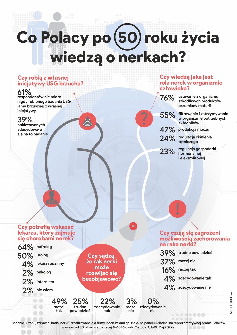 [3] Badanie „Szanuj zdrowie, badaj nerki” zrealizowane dla firmy Ipsen Poland sp. z o.o. na panelu Ariadna, na reprezentatywnej próbie Polaków w wieku od 50 lat wzwyż liczącej N=1046 osób. Metoda: CAWI. Maj 2022 r.