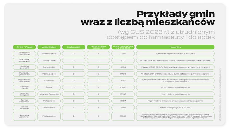 „W naszej gminie brakuje apteki już od ponad 5 lat, a do najbliższej oddalonej o ok. 10 km nie ma komunikacji publicznej. W niedługiej perspektywie nie wyobrażam sobie, aby ta sytuacja miała się nie zmienić. Dysponujemy nawet lokalem z możliwością adaptacji pomieszczeń na potrzeby utworzenia apteki w centralnym punkcie miejscowości w bezpośrednim sąsiedztwie Niepublicznego Zakładu Opieki Zdrowotnej w Niechlowie” - tłumaczy Karol Czapla, wójt gminy Niechlów z woj. Dolnośląskiego.