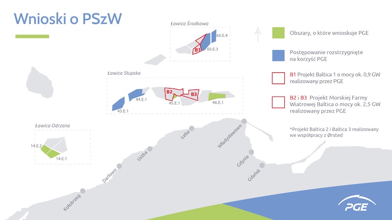 Obecnie Grupa PGE realizuje na Morzu Bałtyckim projekty wiatrowe o mocy ok. 3,4 GW. Po otrzymaniu ostatecznych decyzji PGE będzie mogła zbudować w kolejnych dekadach na wszystkich nowo pozyskanych obszarach dodatkowo ok. 3,7 GW, osiągając łącznie ponad 7,1 GW mocy.