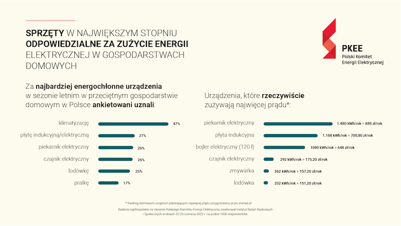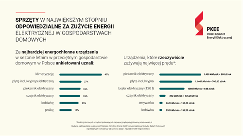 Za najbardziej energochłonne urządzenie w przeciętnym gospodarstwie domowym Polacy uważają klimatyzację – wskazała na nią niemal połowa badanych (47 proc.). Na drugim miejscu znalazła się płyta indukcyjna/elektryczna (27 proc.). Ponadto aż 26 proc. ankietowanych za pobierające najwięcej prądu urządzenia uznało piekarnik i czajnik elektryczny. Co czwarty respondent wskazał lodówkę, a na kolejnych miejscach znalazła się m.in. pralka i suszarka do ubrań (po 17 proc.).