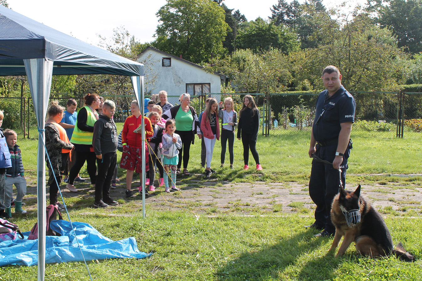 W spotkaniu wziął również przewodnik psa służbowego wraz ze swoim podopiecznym Grafem. Policjant przypomniał zasady jak należy zachowywać się w kontaktach z obcymi czworonogami i co zrobić w przypadku ataku agresywnego psa.