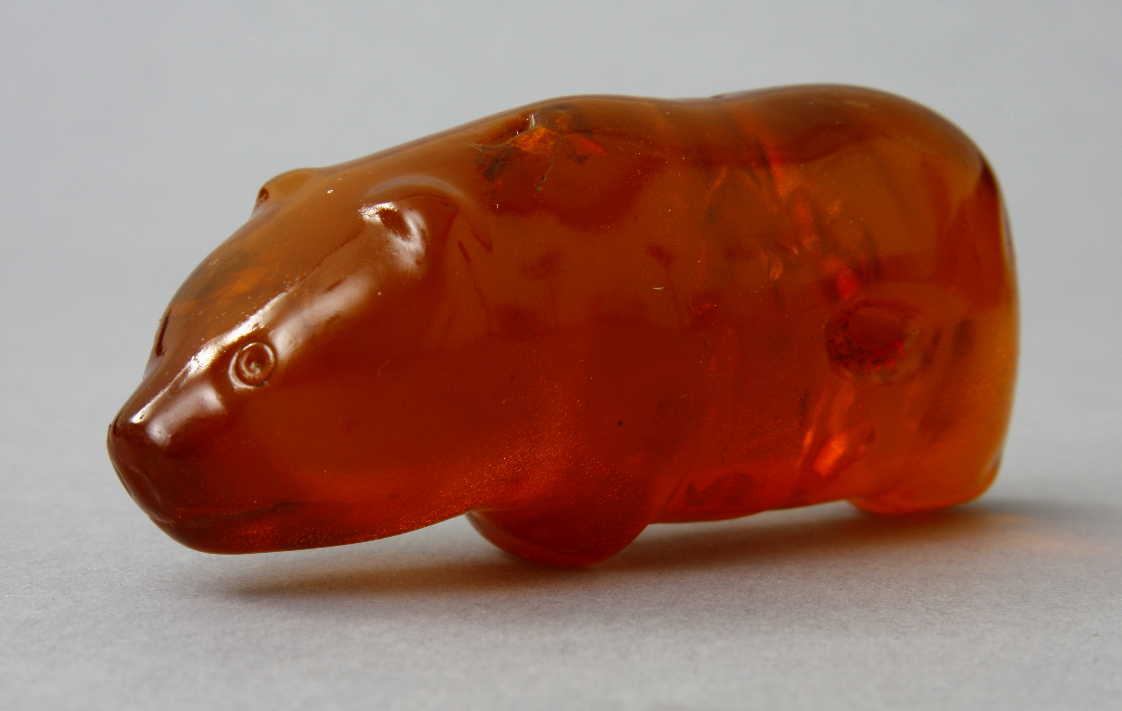Otwór służący do umocowania niedźwiadka nie został wywiercony. Bryła użyta do wykonania rzeźby to surowiec z naturalną dziurą (tzw. nadziak) pozostałą po gałązce, na którą nadziała się zastygająca żywica tworząca bursztyn.