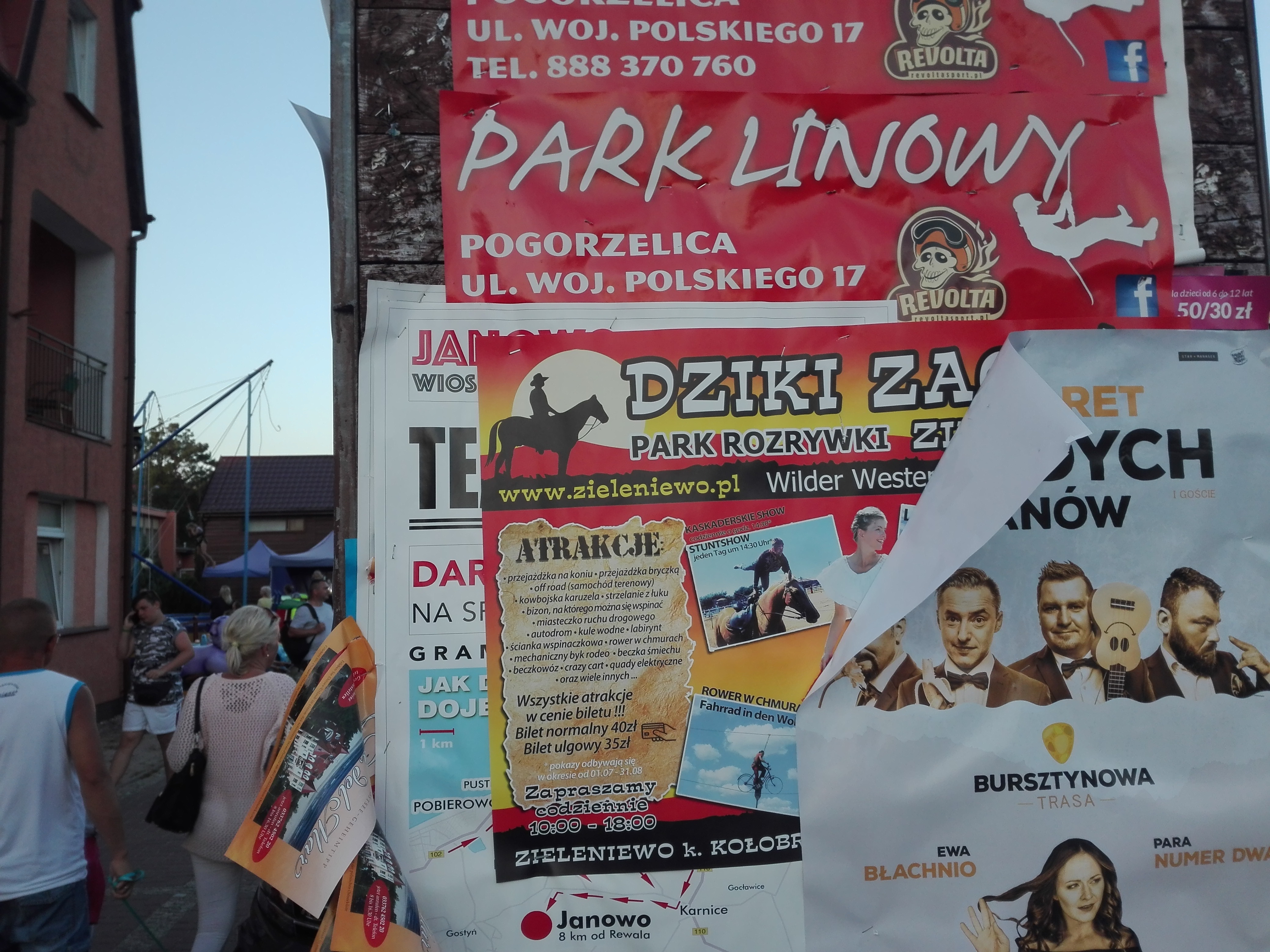 Jak widać na zdjęciu wykonanym na Wybrzeżu Rewalskim, reklama zachęcająca do przybycia na bezpłatny spektakl Teatru Impro z Łodzi, który występuje w Janowie koło Dreżewa, została zasłonięta przez reklamę parku rozrywki „Dziki Zachód” z Zieleniewa koło Kołobrzegu. Potem „kowbojów” przebiła reklama rewalskiego amfiteatru, którego pracownicy dbają o to, by ich było na wierzchu.