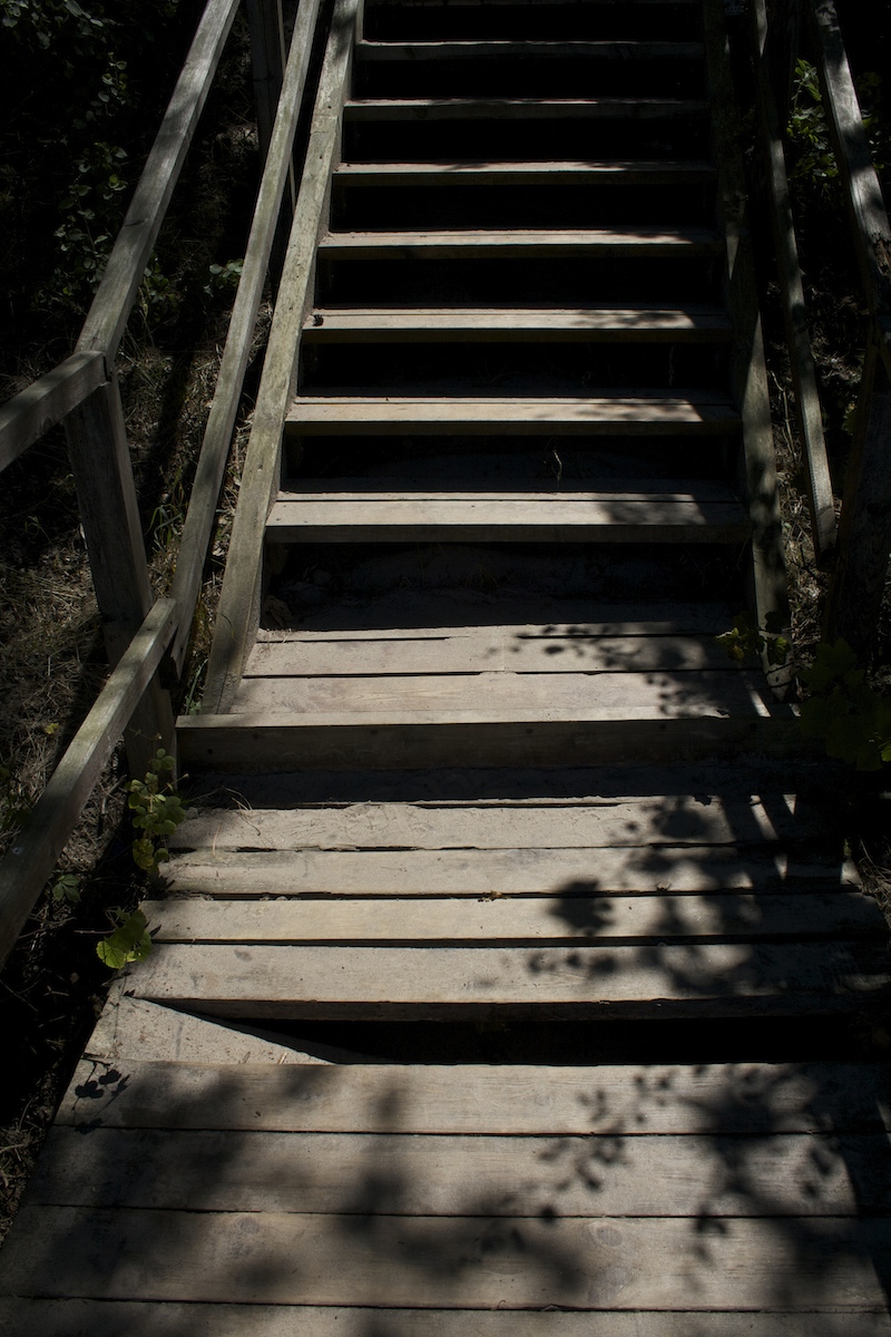 Podobna sytuacja wygląda dalej na zachód, gdzie jest zejście na plażę na wysokości domku Ewy Braun. Spostrzeżenia naszej Czytelniczki są słuszne. Na samym dole brakuje połowy schodka, a nieco wyżej jedna z desek jest wyrwana i wisi w powietrzu. Tylko czekać, aż ktoś wsadzi tam nogę.