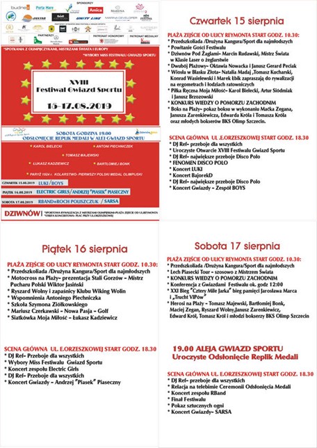 W czwartek rozpoczął się w Dziwnowie osiemnasty Festiwal Gwiazd Sportu, na który przyjechali byli i obecni medaliści olimpijscy, mistrzowie świata i Europy. Oficjalnego otwarcia festiwalu dokonał burmistrz Dziwnowa Grzegorz Jóźwiak. Potem były wspólne zdjęcia sportowców z wczasowiczami oraz gry i konkursy na plaży. Sporym zainteresowaniem cieszyła się także przedszkoliada, podczas której najmłodsi pod okiem instruktorów mogli wzajemnie ze sobą rywalizować.