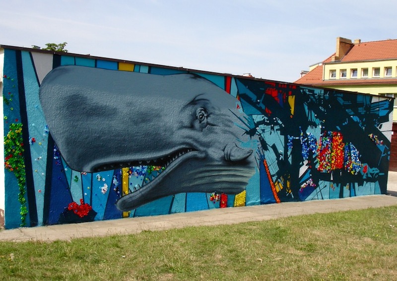 Wykonany mural upamiętnia mitycznego białego wieloryba z książki „Moby Dick” Hermana Melville’a w 200. rocznicę urodzin amerykańskiego pisarza. Wakacyjna akcja KBP pn. „#mobydickchallenge, czyli koszaliński sztorm ekologiczny…” jest dofinansowana z Narodowego Centrum Kultury. ©℗