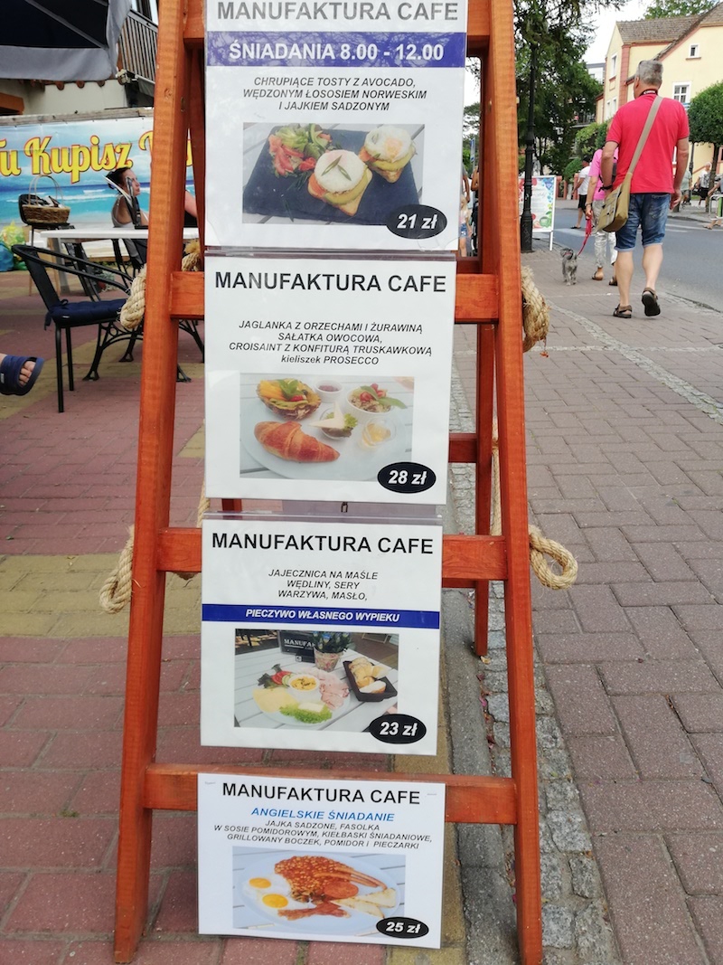 Gastronomia nadmorska przygotowana jest na żywienie turystów przez cały dzień. Wiele placówek pracuje od samego rana, by wyżywić tych, którzy mieszkają na kwaterach i nie mają warunków do przygotowania sobie posiłków lub po prostu im się nie chce. W końcu wakacje to wakacje. Na tych, którzy wolą pójść na śniadanie, czekają lokale, gdzie można coś sobie wybrać. Ceny jednak nieco odstraszają. Bo przecież jeżeli pójdzie rodzina czteroosobowa, to wyda lekko przeszło sto zł za jedno śniadanko. Jak widać na zdjęciu, w jadłospisie nie ma ani herbaty (ok. 5-7 zł), ani też kawy (ok. 8-10 zł).