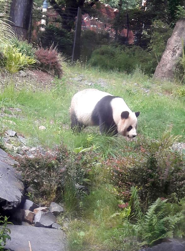 Wenn Sie auf diesem Weg zurückkommen und am Bison vorbeigehen, erreichen Sie den Panda Garten. Panda Meng Meng und Jiao Qing leben getrennt. Es gibt auch eine chinesische Pagode. Diese Pandas sind aus China nach Berlin gekommen. Auf der ganzen Welt leben nur etwa 2000 Pandas in freier Wildbahn.